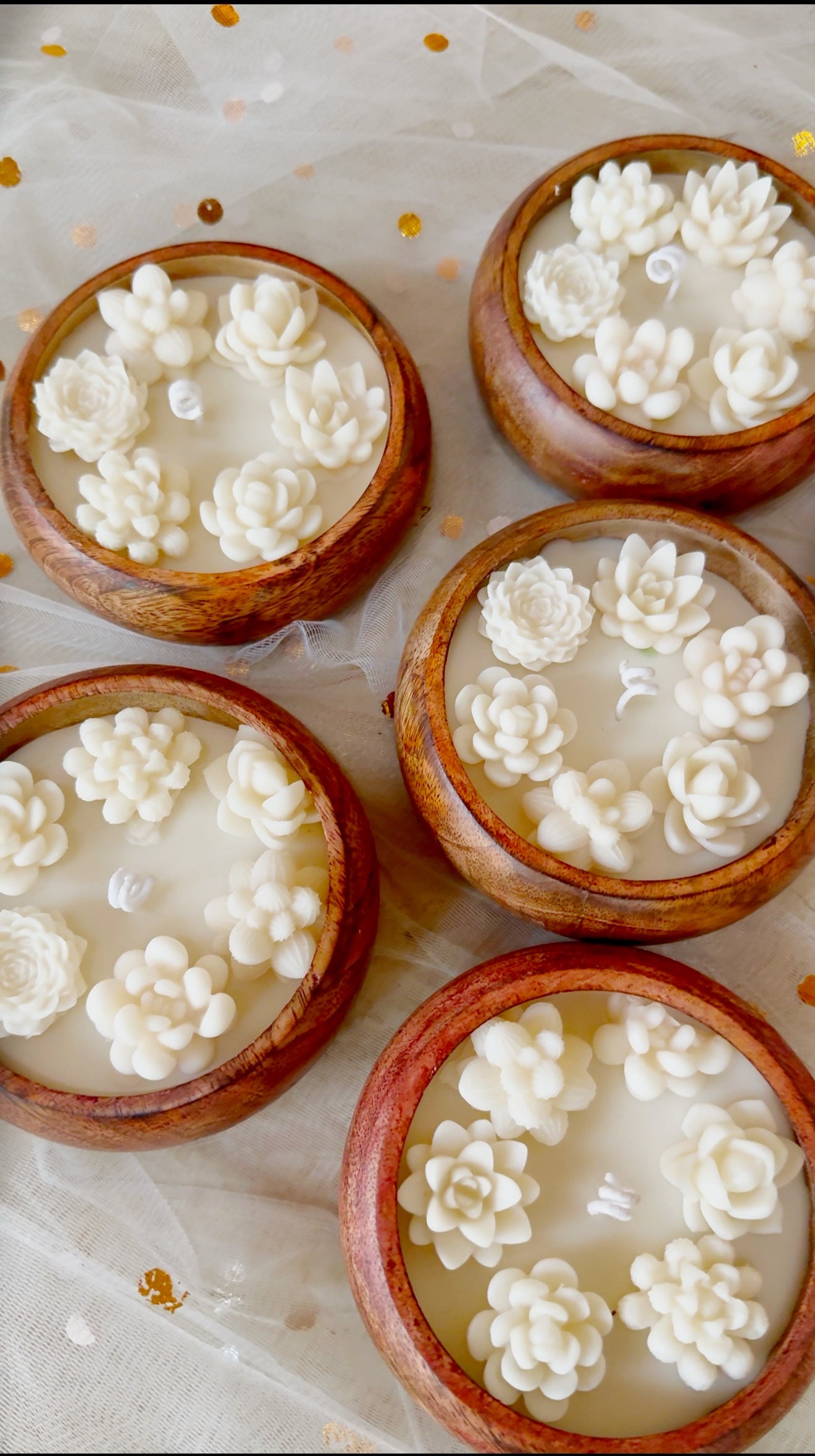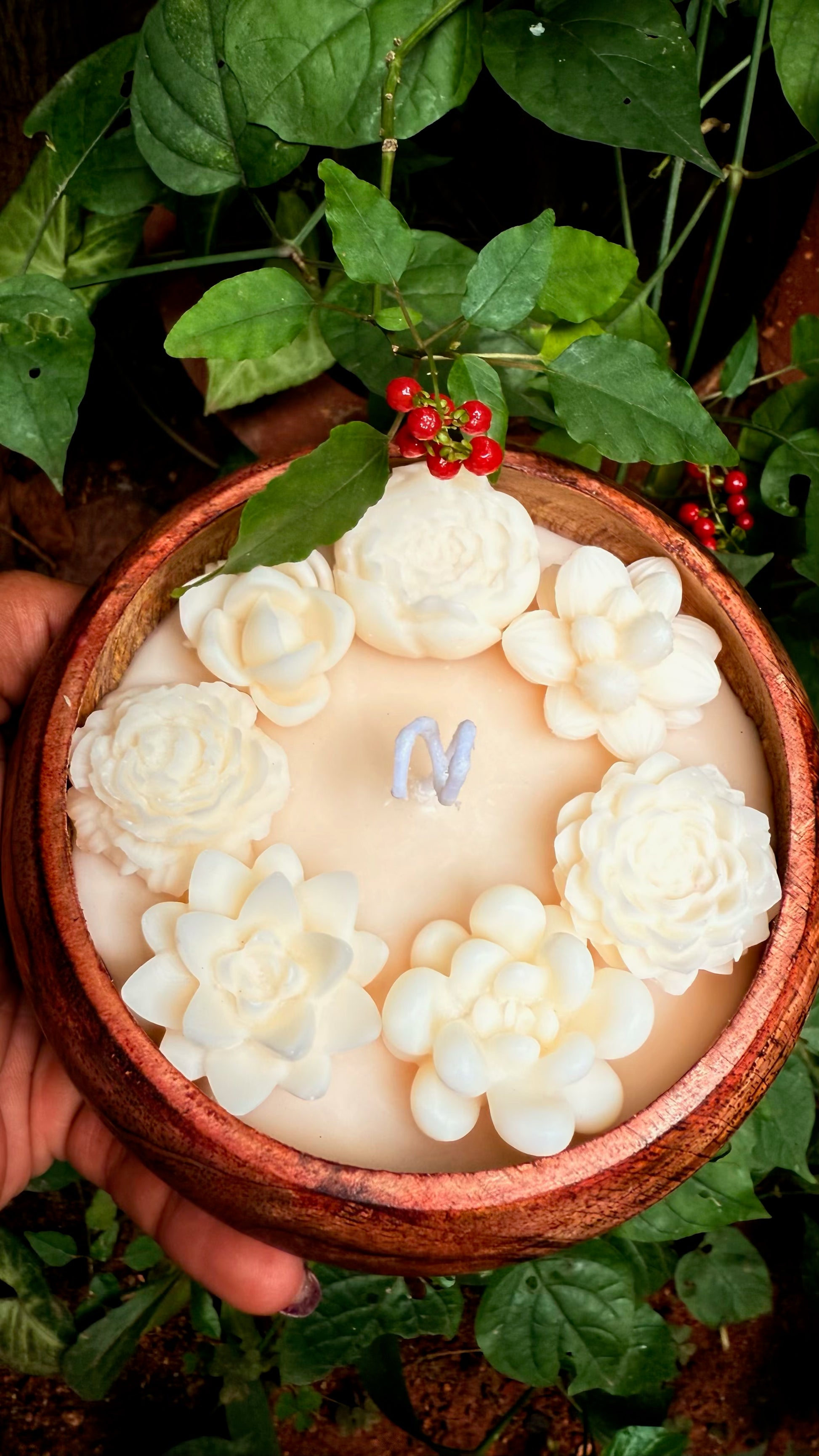 Indulge in the luxurious, sensual scent of whire oud. Made of pure soy wax, the white flowers on white base design adds a touch of elegance to any room. The warm glow and fragrant aroma will transport you to a state of pure relaxation and indulgence. Perfect for a peaceful evening in on our luxurious sheesham wood.