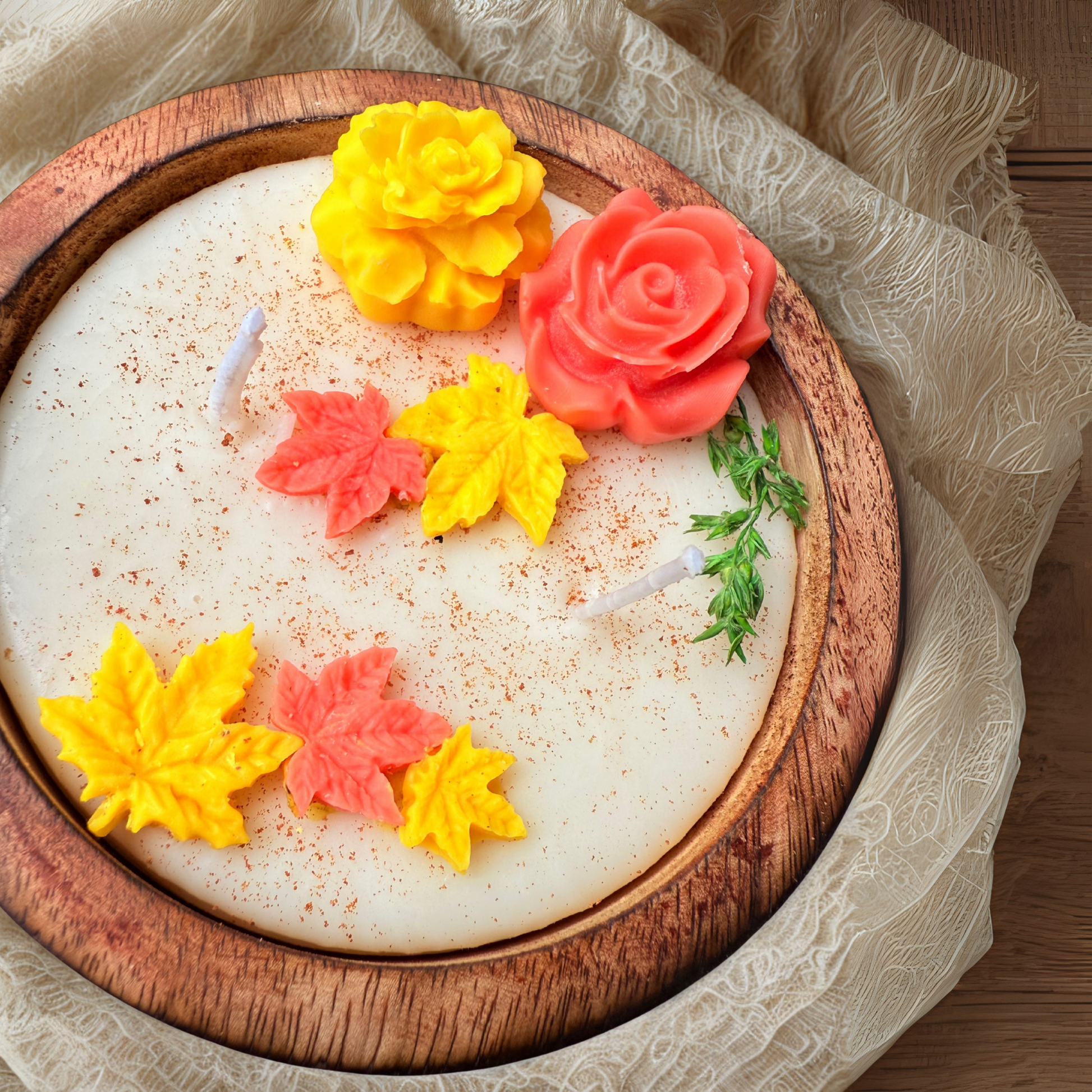 Flame & Flora is a handcrafted wooden bowl candle adorned with sculpted wax blooms and herbs. A sensory blend of botanical beauty and warm ambiance—designed to be admired before it’s lit.